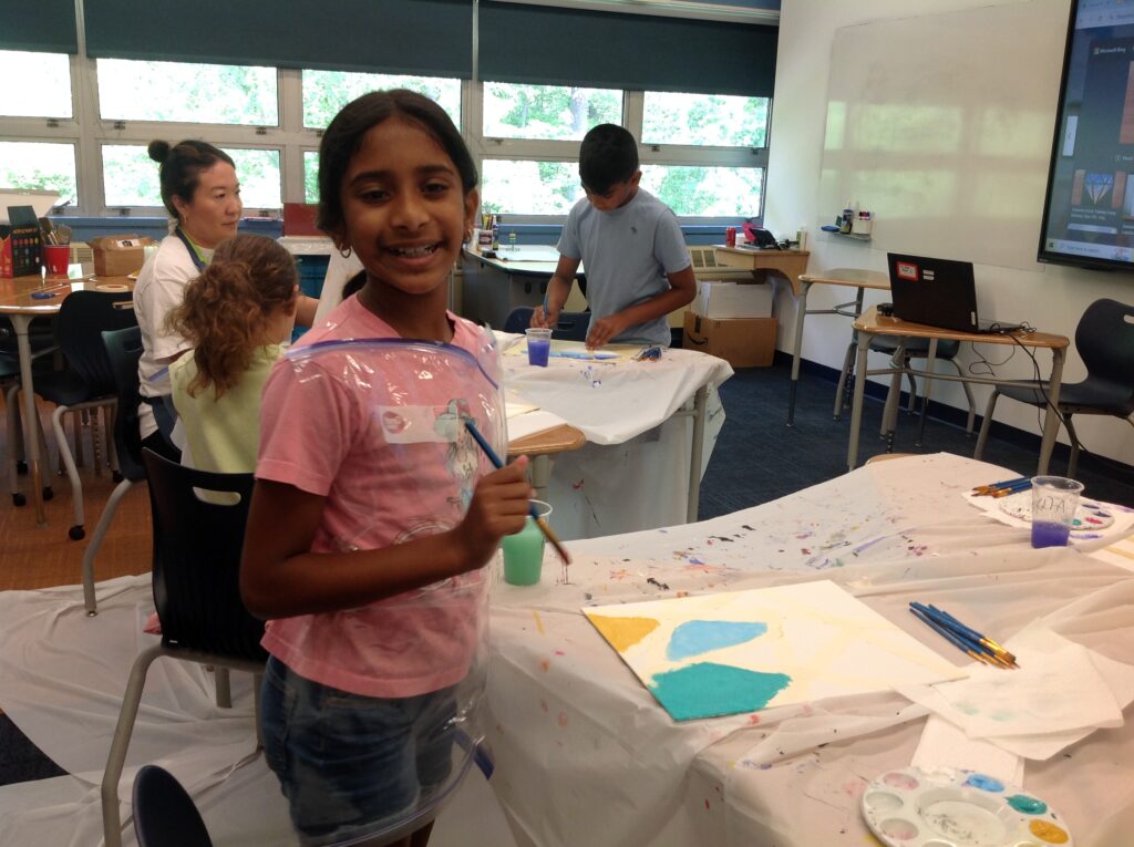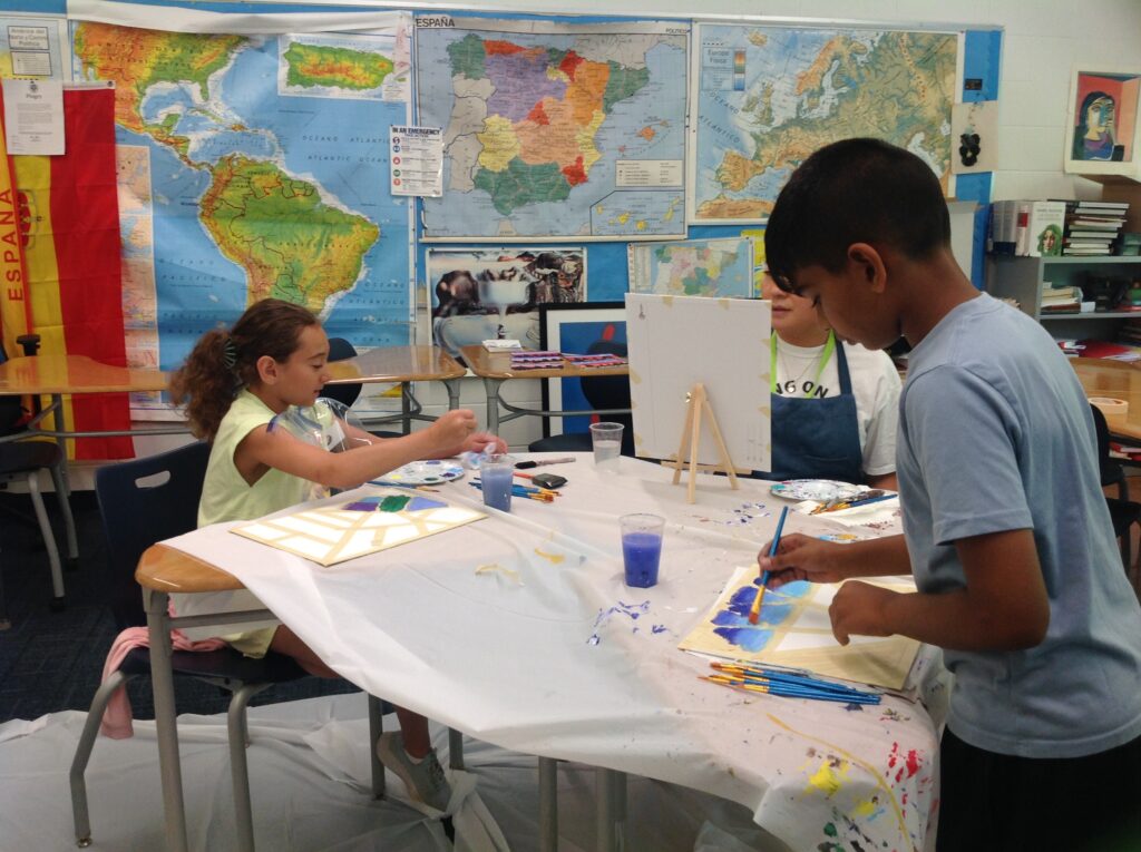 This week at Basking Ridge we have some Picasso’s and Da Vinci’s in the making! Our artists today learned about using masking tape on their canvases to create shapes and have precise lines. Our artists have become very creative with their works, using gradience and different colors to make each of their works so unique! Our campers are so excited to keep learning about art, and using their skills to make a replica of “A Starry Night” by Leonardo Da Vinci on Friday! Stayed tuned for the final results!